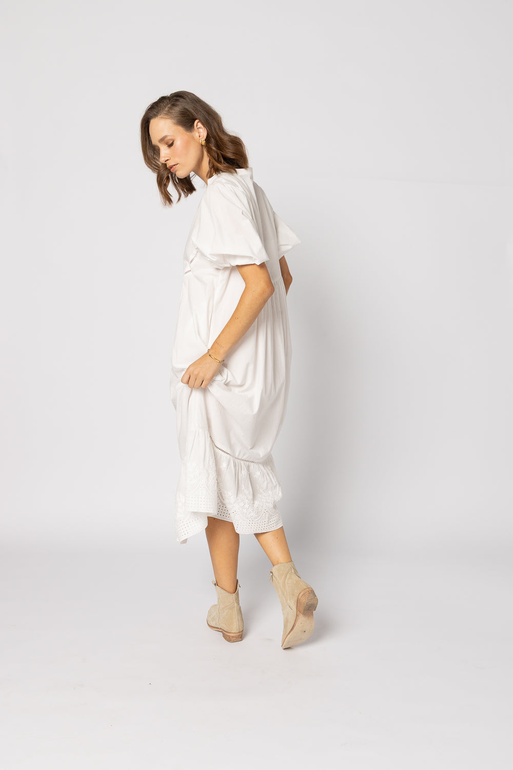 The Josephine Dress from Drama the Label is effortlessly wearable and serves as the ideal choice for any event. It showcases a button front, ladder lace detailing, a midi length, puff sleeves, convenient pockets, and an embroidered trim at the hemline.