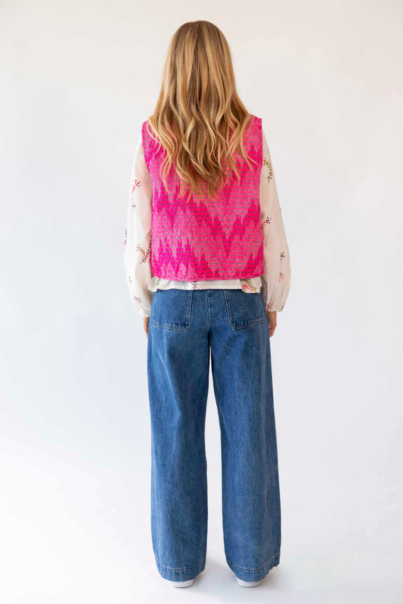 Cairo vest is a vibrant addition to your wardrobe. Crafted from a heavy jacquard-woven fabric with a bold zigzag pattern in pink tones, it adds instant personality to any look.