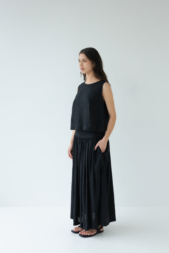 A gathered skirt with fullness held together with a flattering wide waistband. Enclosed using an invisible zip at the side seam, featuring side pockets for ease & comfort.